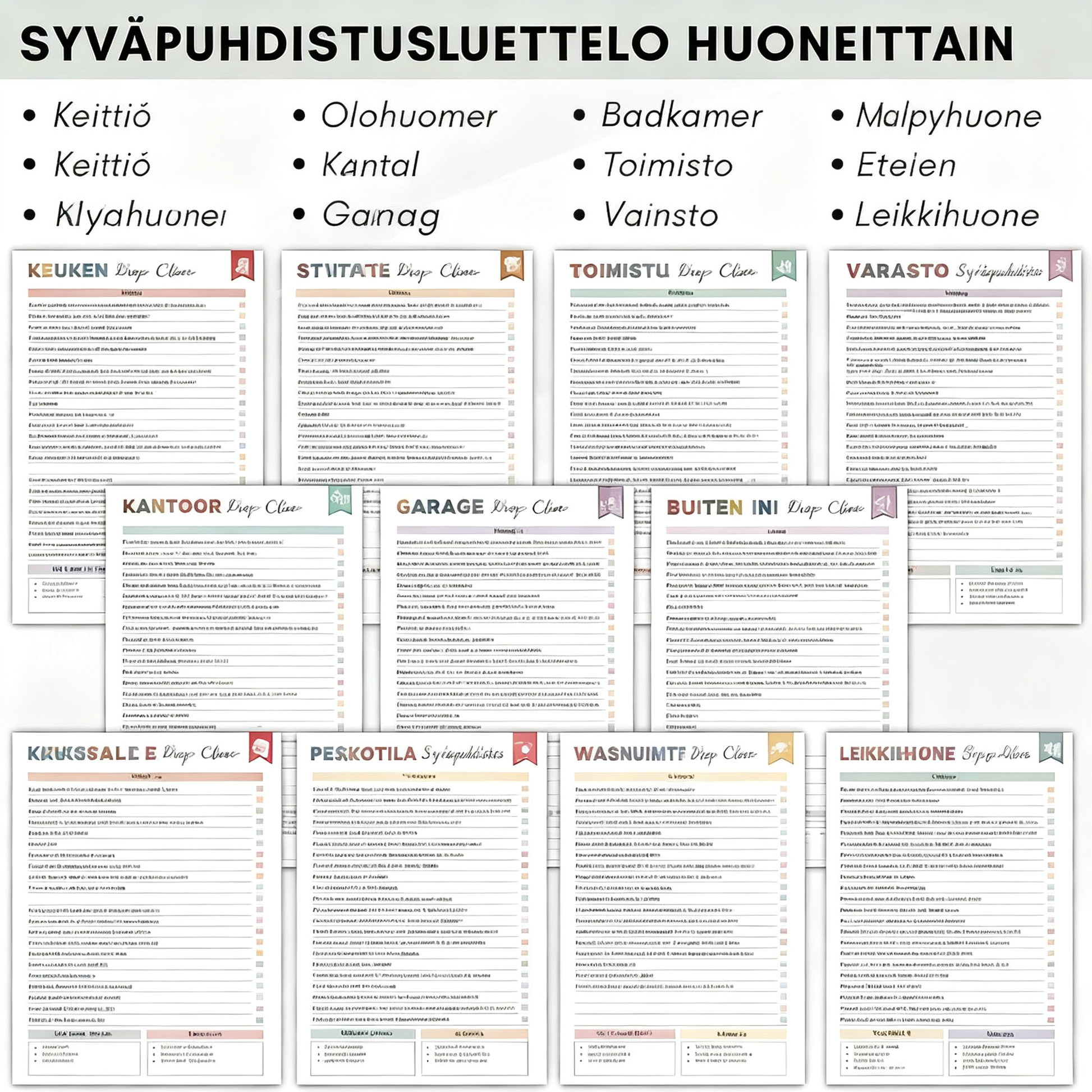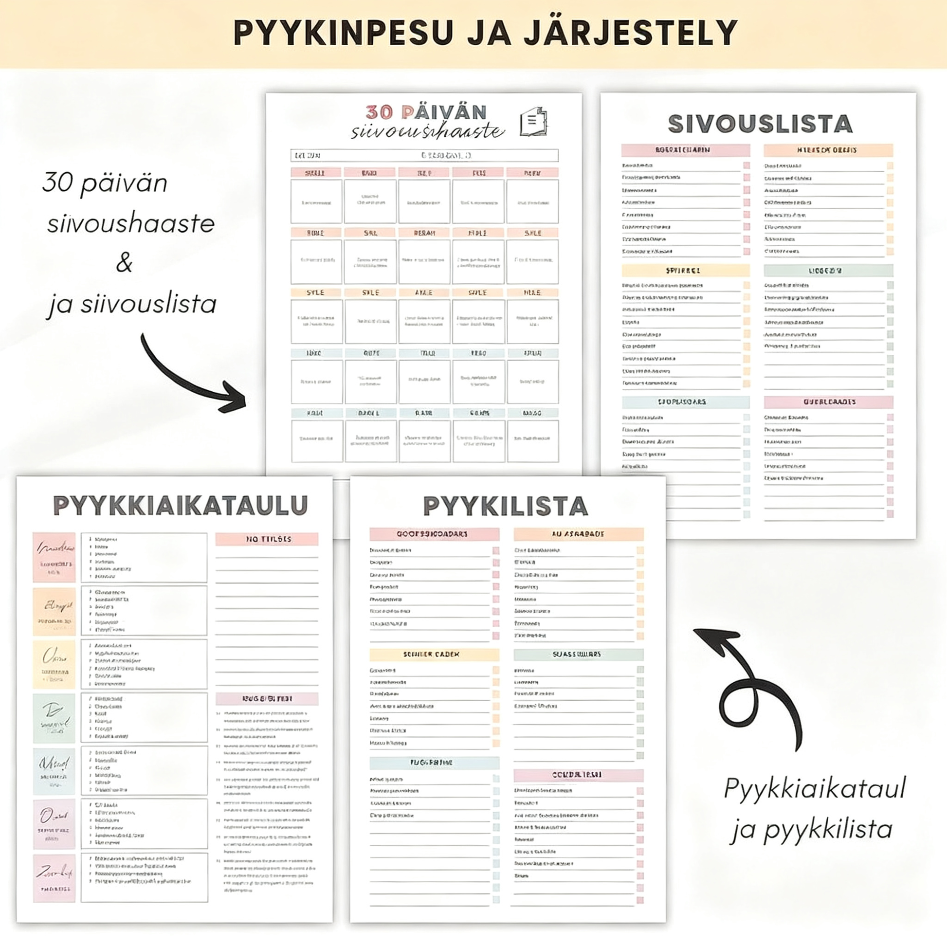 Mukana viikko‑, kuukausi‑ ja vuositasoiset siivouslistat, jotka pilkkovat tehtävät pieniin, saavutettaviin osiin. Näin pystyt seuraamaan edistystäsi omassa tahdissa ja tunnet jatkuvasti hallinnan tunnetta – ei enää lykkäämistä tai unohtuneita askareita.