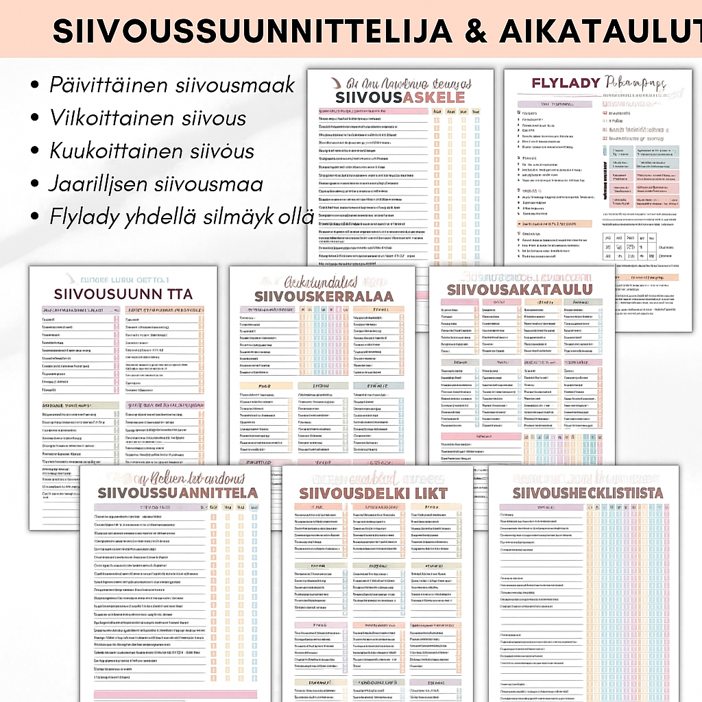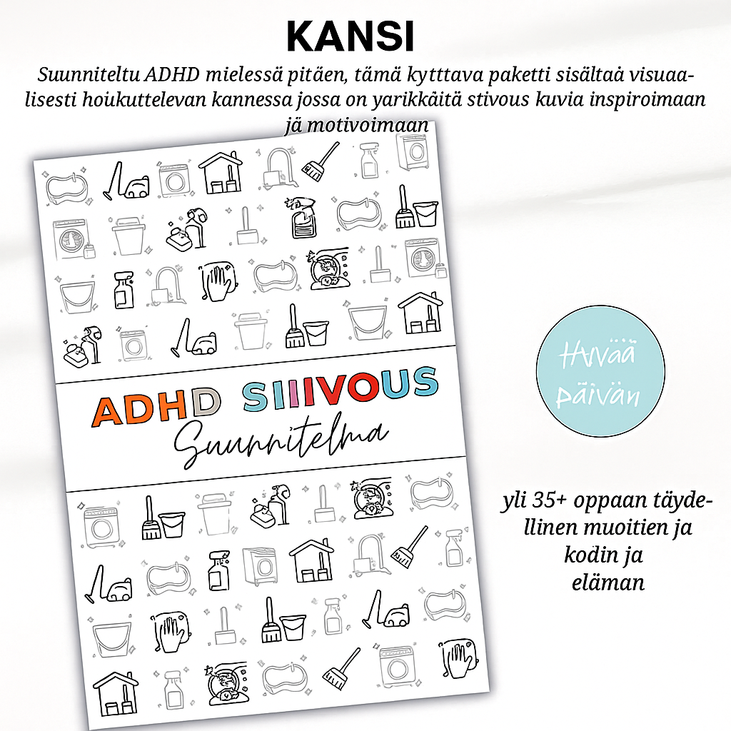 Tuntuuko koti jatkuvasti sekavalta tai tehtävät unohtuvat kesken kiireiden? Tämä ADHD‑ystävällinen siivous‑ ja organisointipaketti auttaa sinua palauttamaan järjestyksen helposti ja ilman stressiä. Ei enää ylikuormitusta – vain selkeät askeleet ja rauhallisempi mieli.