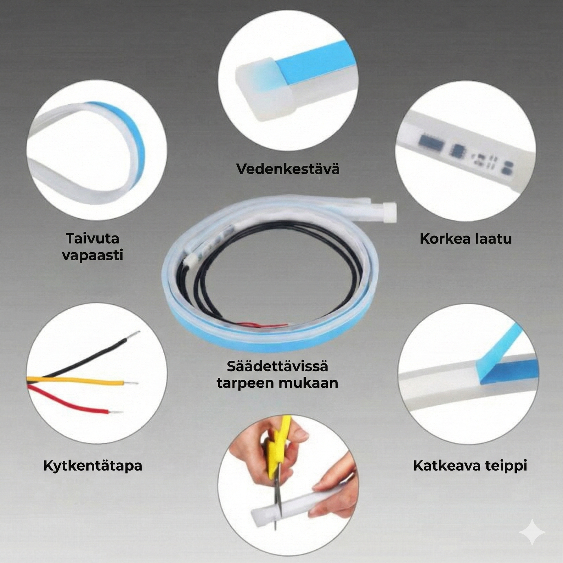 Älä anna sateen, lumen tai mudan estää sinua – tämä LED-nauha on täysin vedenpitävä ja suunniteltu kestämään vaihtelevaa säätä. Korkealaatuinen PVC-materiaali ja vankka tiivistys varmistavat kirkkauden ja toimivuuden pitkään. Ihanteellinen valinta autoilijoille, jotka haluavat kestävän ja luotettavan valaistuksen.