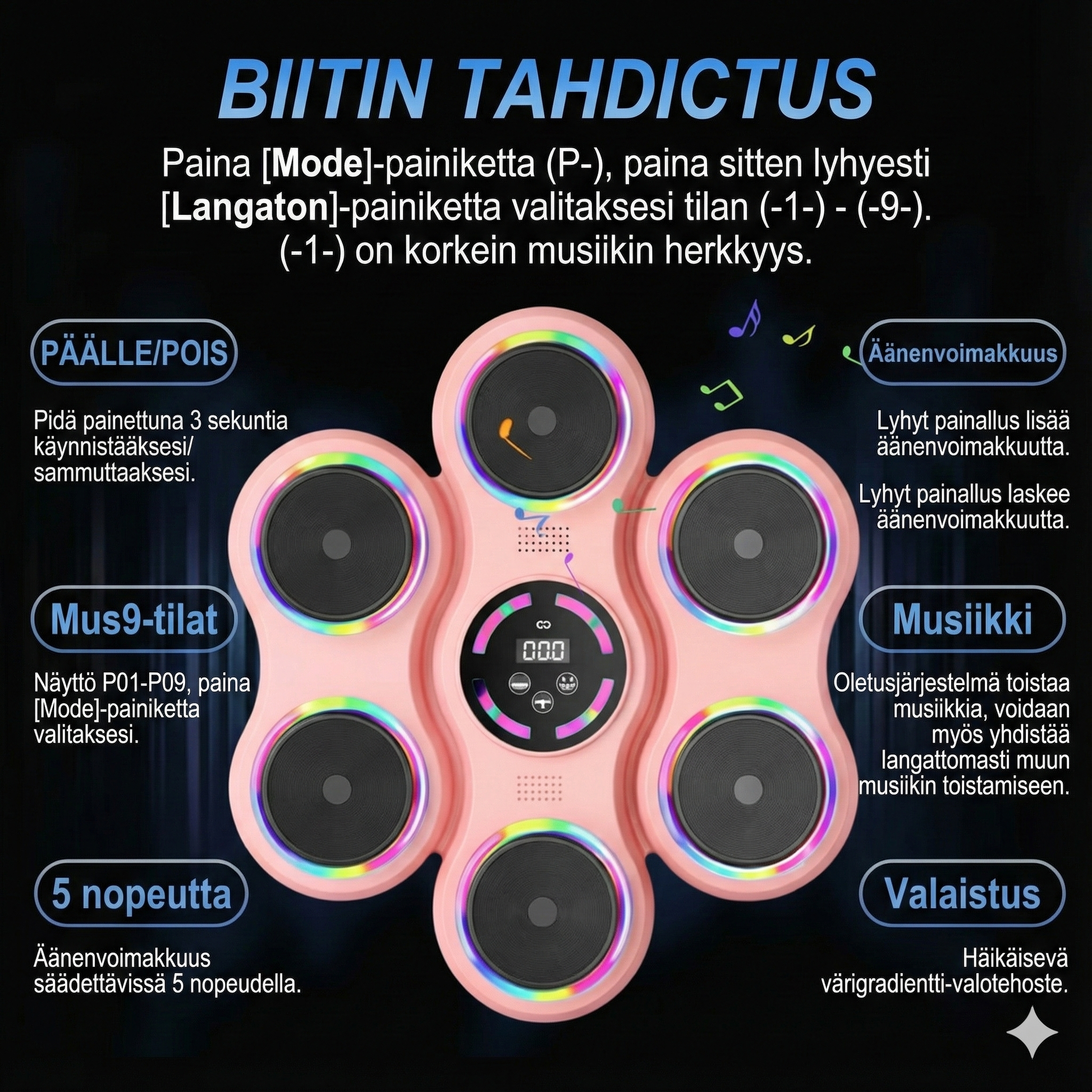 Pidä mielenkiinto yllä paremmin kuin koskaan synkronoiduilla, rytmisillä valoilla, jotka ohjaavat jokaista liikettä. Nämä visuaaliset merkit varmistavat, että jokainen isku tuntuu vaikuttavalta ja palkitsevalta, mikä antaa lapsesi itseluottamukselle välittömän boostin. Eloisat valoefektit muuttavat tylsän harjoituksen jännittäväksi, pelinomaiseksi elementiksi, joka kehittää silmä-käsi-koordinaatiota leikiten.