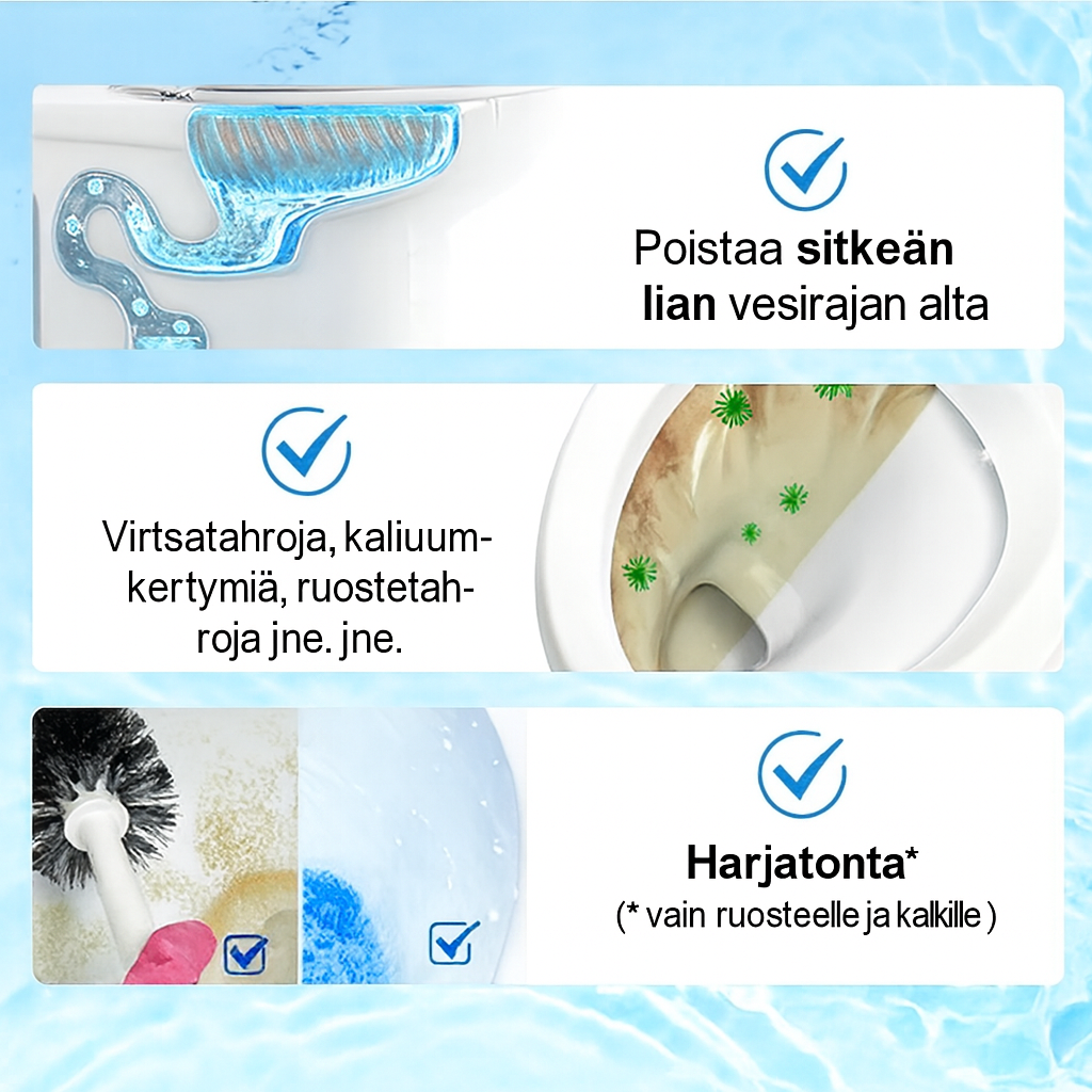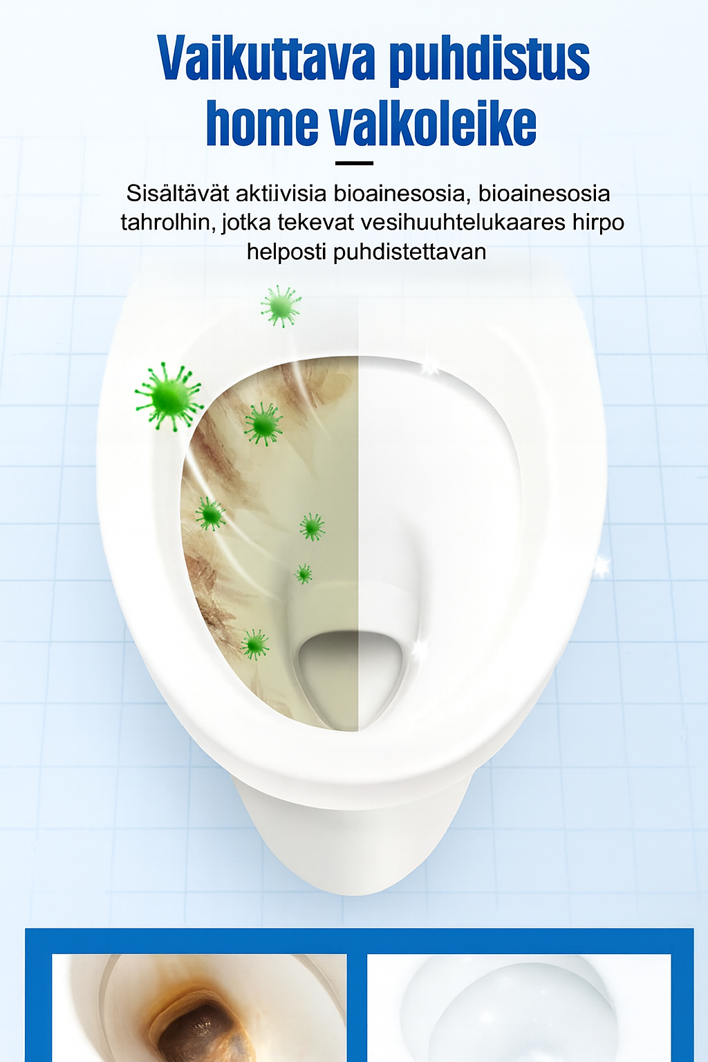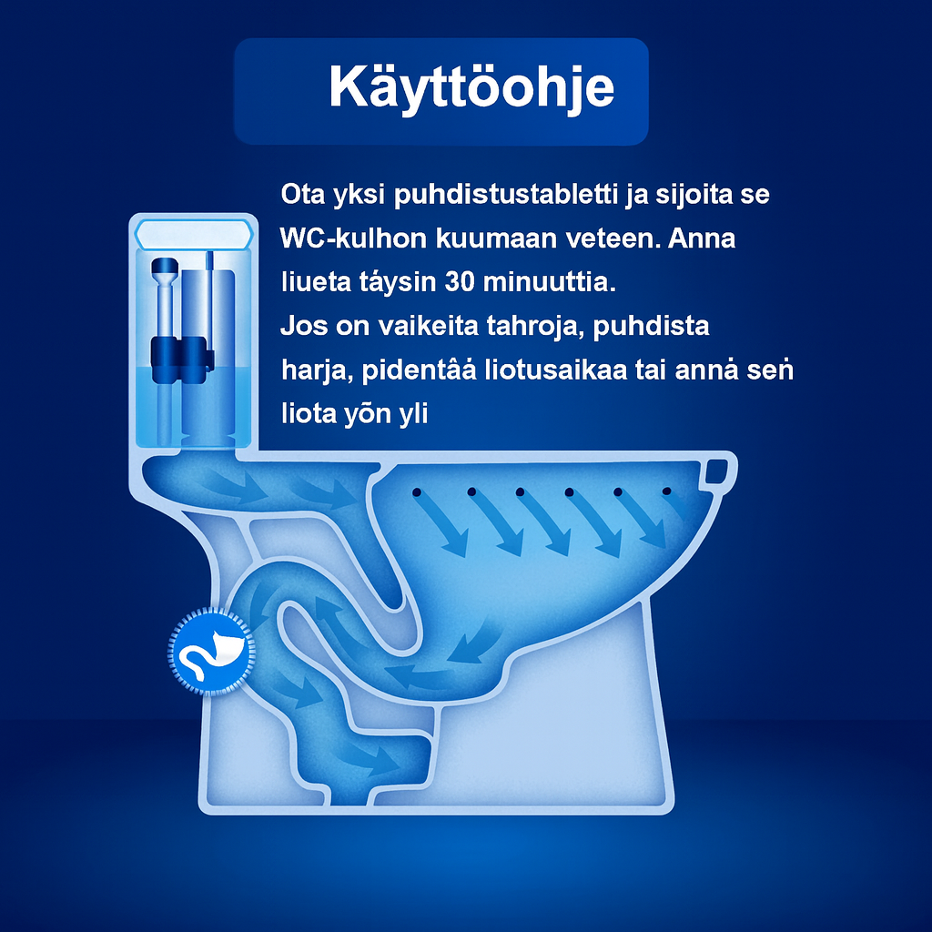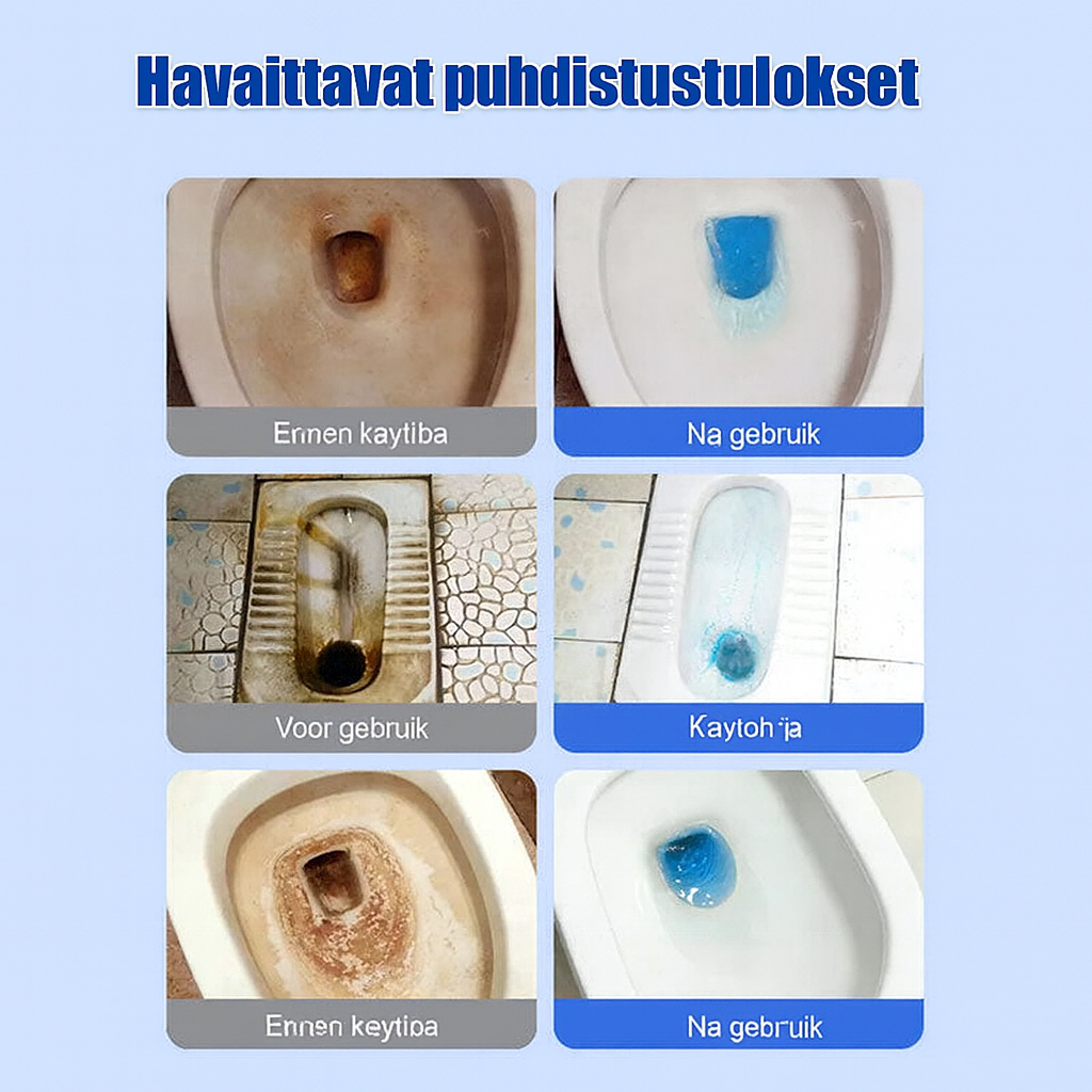Unohda turha kuuraaminen! Nämä tehokkaat puhdistustabletit liuottavat kalkkisaostumat, ruosteen ja pinttyneet tahrat nopeasti vedessä. Aktiivinen koostumus ulottuu myös paikkoihin, joihin harja ei pääse – jättäen WC:n säihkyvän puhtaaksi jokaisella huuhtelulla.