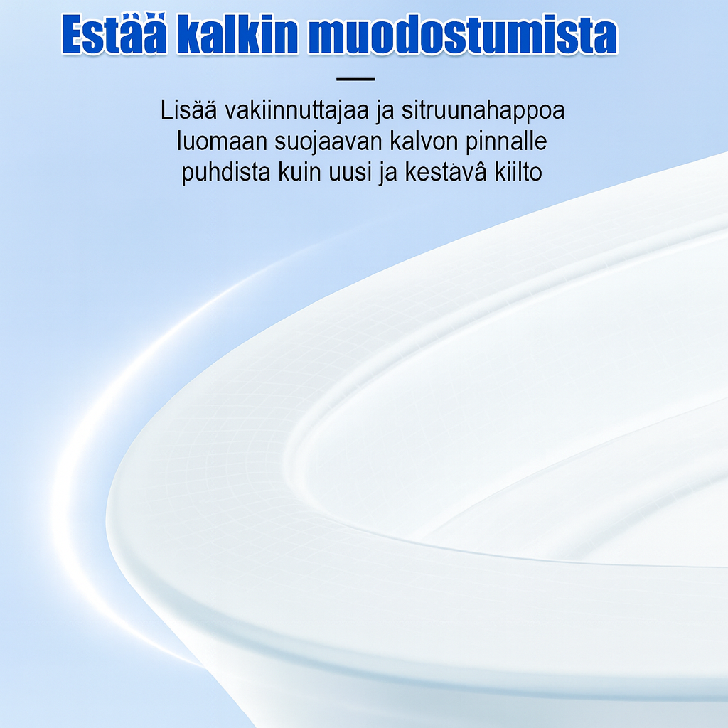 Hellävarainen mutta voimakas koostumus on biohajoava ja suunniteltu suojelemaan WC-posliinia. Samalla se poistaa tehokkaasti likaa ja muodostaa suojakalvon, joka auttaa ehkäisemään uusien tahrojen syntymistä ja säilyttää kiiltävän pinnan pidempään.