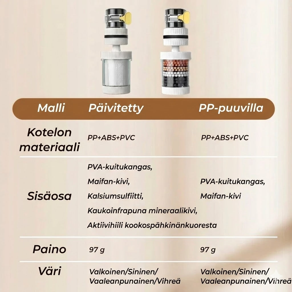 Valitse päivitetty malli ja hyödy jopa 5 mikronin suodatustarkkuudesta PVA-kuitukankaan ansiosta. Maifan-kiven, kalsiumsulfiitin ja kookoksenkuoresta valmistetun aktiivihiilen tehokas yhdistelmä poistaa vedestä pienimmätkin hiukkaset, raskasmetallit ja värjäytymät. Tämä huipputeknologia nostaa vedenpuhdistuksesi tehokkuutta merkittävästi ja varmistaa puhtaan veden jokaisella litralla. Niille, jotka etsivät yksinkertaisempaa ratkaisua, PP-puuvillainen malli tarjoaa luotettavan perussuodatuksen päivittäiseen puhtaaseen veteen.