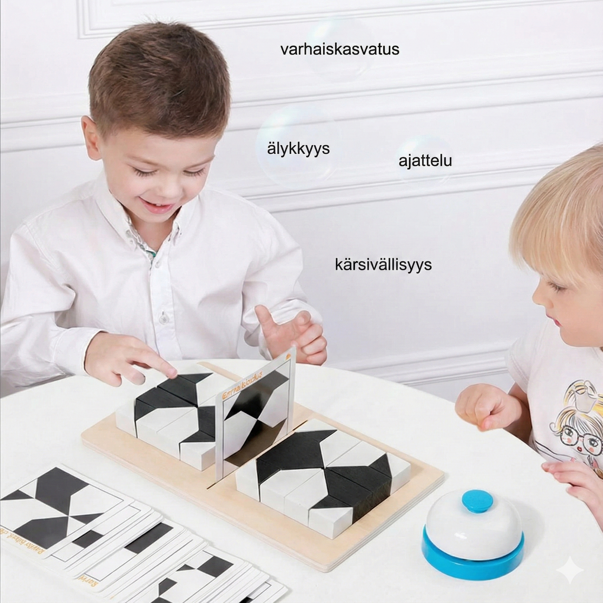 Periaate on yksinkertainen mutta koukuttava: nosta kortti, rakenna kuvio mahdollisimman nopeasti ja paina kelloa ensimmäisenä voittaaksesi. Peli on erittäin helppokäyttöinen ja toimitetaan täydellisenä settinä, sisältäen puisen pelilaudan ja soittokellon äärimmäistä kisakokemusta varten. Monipuolisten yhdistelmämahdollisuuksien ansiosta jokainen pelikerta on ainutlaatuinen, mikä lisää oppimisprosessin tehokkuutta samalla kun hauskanpito pysyy aina keskiössä.