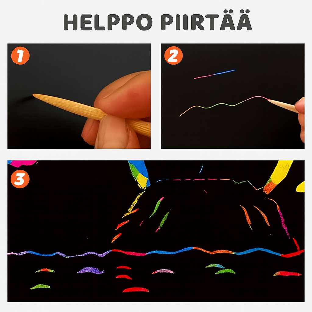 Tee jokaisesta raapaisusta taianomainen hetki! Tämä sateenkaaren raaputuskirja kätkee mustan pinnan alle kirkkaat värit, jotka ilmestyvät esiin puutikulla. Jokainen veto tuo esiin uuden vivahteen – täydellinen luovuuden vapauttamiseen sekä lapsille että aikuisille.