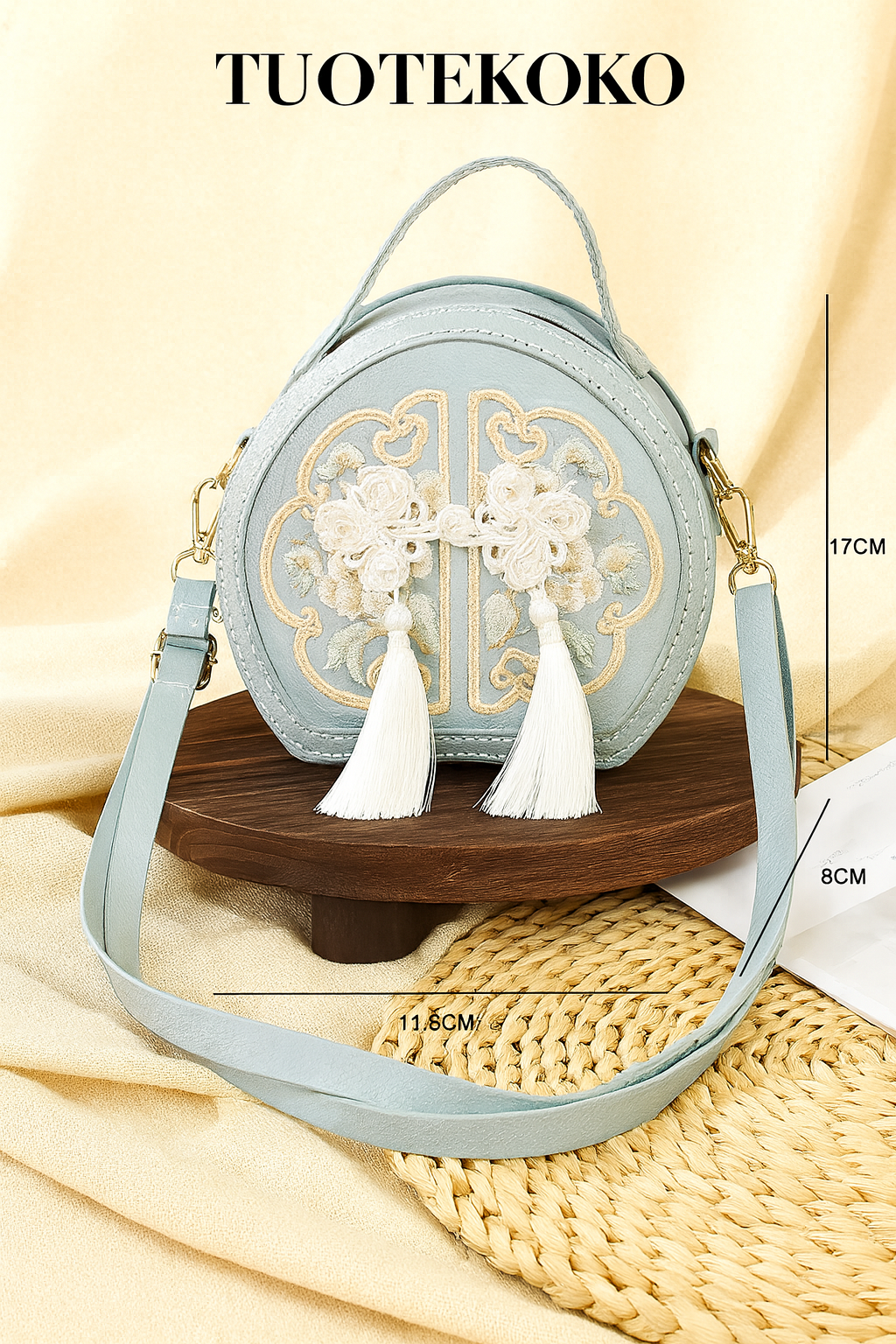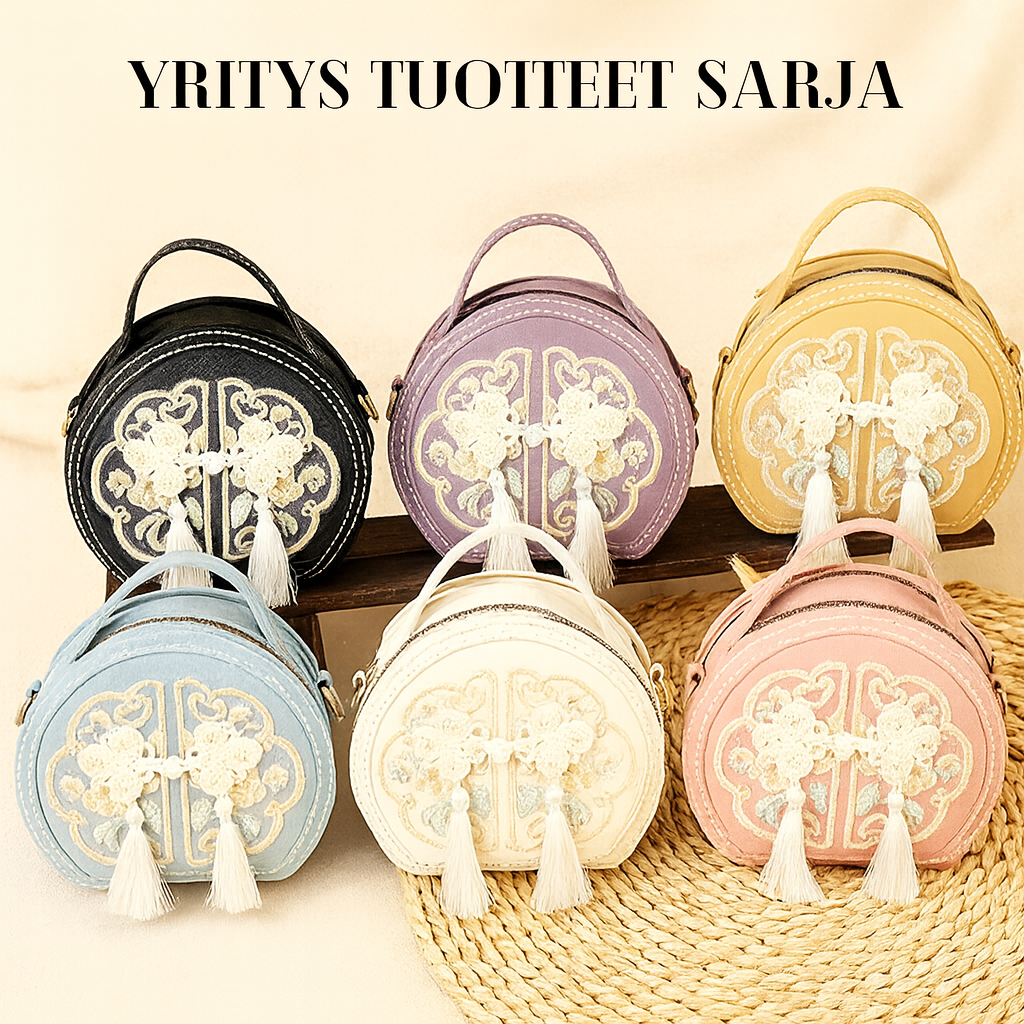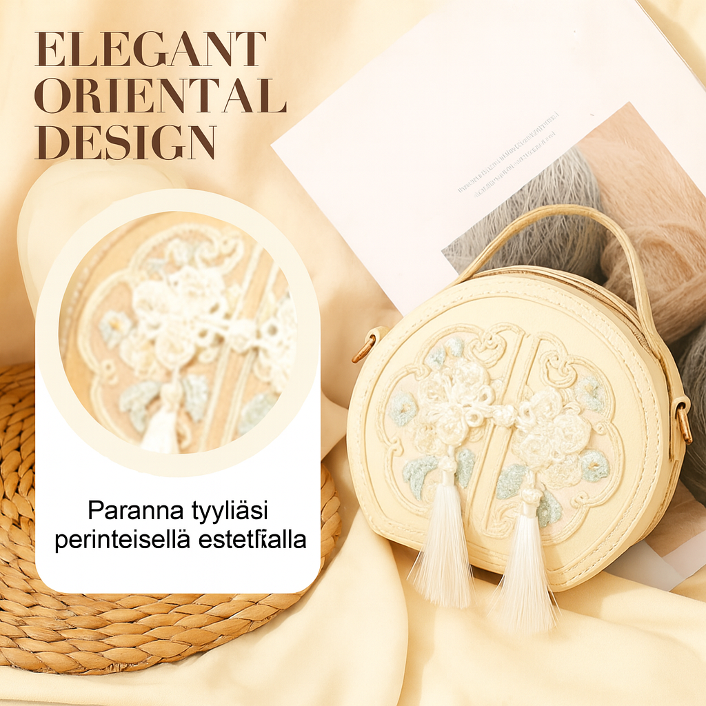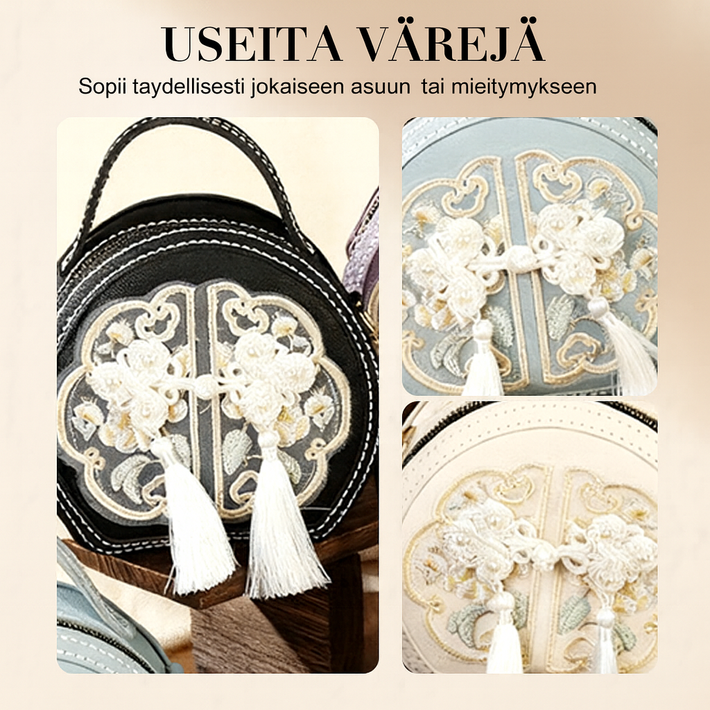 Laukun klassinen pyöreä muoto ja kaunis kirjontakuviointi tuovat siihen eleganssia ja yksilöllistä ilmettä. Valittavissa useita värejä, kuten vaaleanpunainen, musta tai khaki, jotka sopivat helposti sekä arkeen että juhlaan.