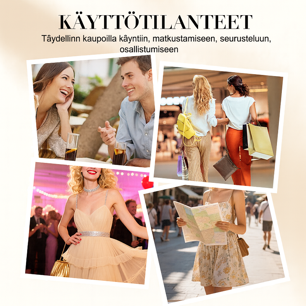 Voit kantaa laukkua olalla, kädessä tai vartalon yli crossbody-tyyliin. Se on sekä käytännöllinen että trendikäs valinta niin arjen menoihin, juhliin kuin vapaa-aikaan. Kevyt, mutta riittävän tilava tärkeimmille tavaroille.