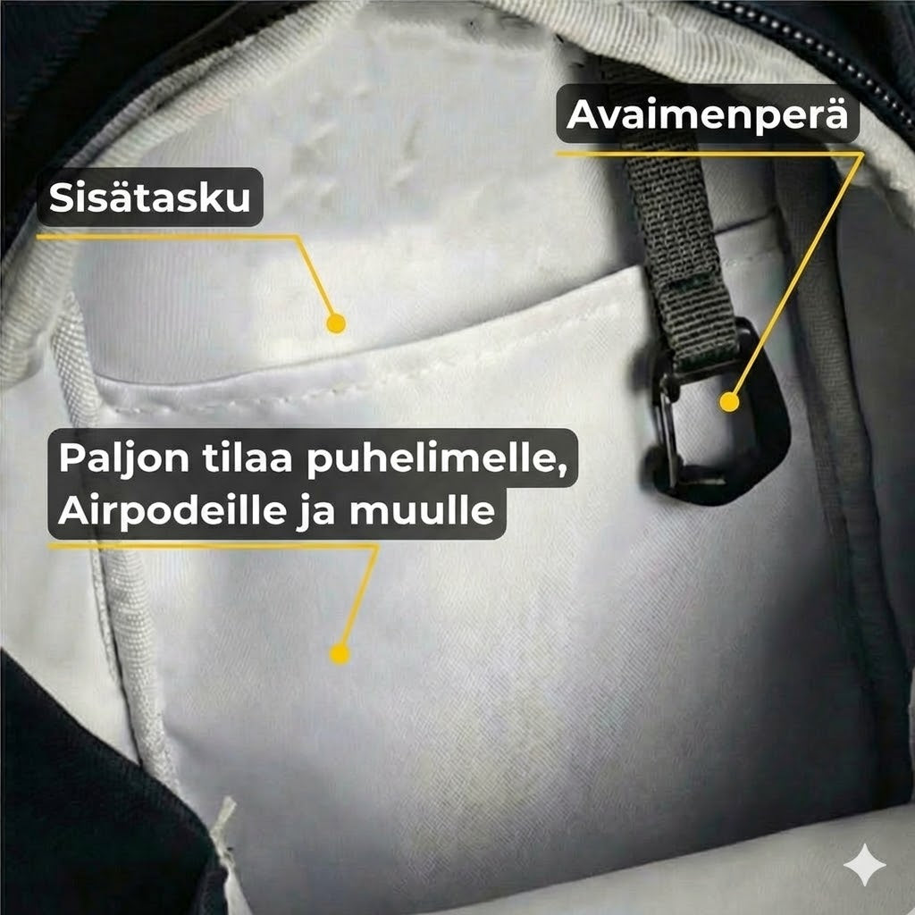 Erityinen älypuhelintasku on suunniteltu sopimaan kaikille suurille malleille, kuten iPhone Pro Max tai Samsung Ultra, ilman tarvetta poistaa suojakuorta. Kätevä avainklipsi varmistaa, ettei sinun tarvitse enää koskaan kaivella avaimiasi treenin päätteeksi, mikä tehostaa rutiiniasi merkittävästi. Tilava päälokero on optimoitu jopa 1,5 litran juomapulloille, joten nesteytys pysyy kunnossa ilman säätöä. Tämä huikea käyttömukavuus tarkoittaa, että säilytät kaiken – Airpodeista jäsenkortteihin – yhdessä paikassa, etkä enää koskaan unohda mitään laitteisiin.
