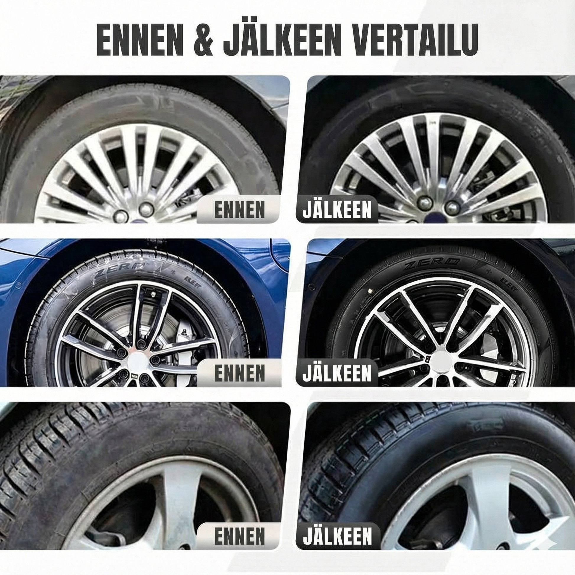 Yksi suihkaus muuttaa haalistuneet ja kuluneet renkaat syvän mustiksi ja peilikirkkaiksi. Ainutlaatuinen organosipiihartsia sisältävä koostumuksemme vaikuttaa välittömästi autosi ulkonäköön. Toisin kuin rasvaiset vaihtoehdot, jotka keräävät likaa, tämä suihke antaa ammattimaisen viimeistelyn, jolla autonrenkaasi näyttävät heti kuin uusilta. Tämä on nopein tapa palauttaa ajoneuvosi tyylikkyys ilman tuntien hinkkaamista.