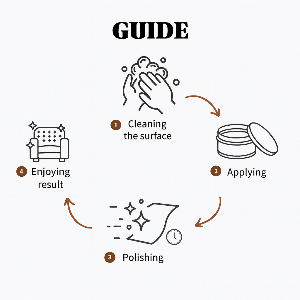 Med den enkla 3-stegsmetoden: rengör, applicera, polera ser ditt läder ut som nytt på några minuter. Krämen torkar snabbt, lämnar inga fläckar och känns aldrig kladdig. Du får ett professionellt resultat hemma, utan behov av en dyr läderhantverkare.