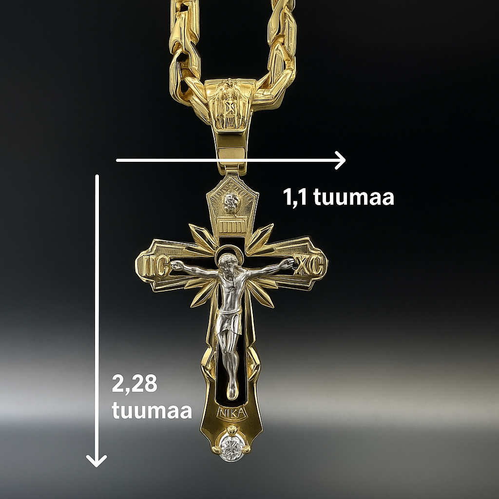 Yksityiskohtainen muotoilu esittää ristiinnaulittua Jeesusta, jota ympäröivät pyhät kaiverrukset, jotka symboloivat rakkautta, anteeksiantoa ja voittoa pimeydestä. Tämä ainutlaatuinen koru yhdistää hengellisen perinteen ja ajattoman eleganssin, tehden siitä sekä hengellisen symbolin että muistutuksen omasta voimastasi. Korua pidetään tapana torjua negatiivista energiaa ja houkutella myönteisiä värähtelyjä elämään.