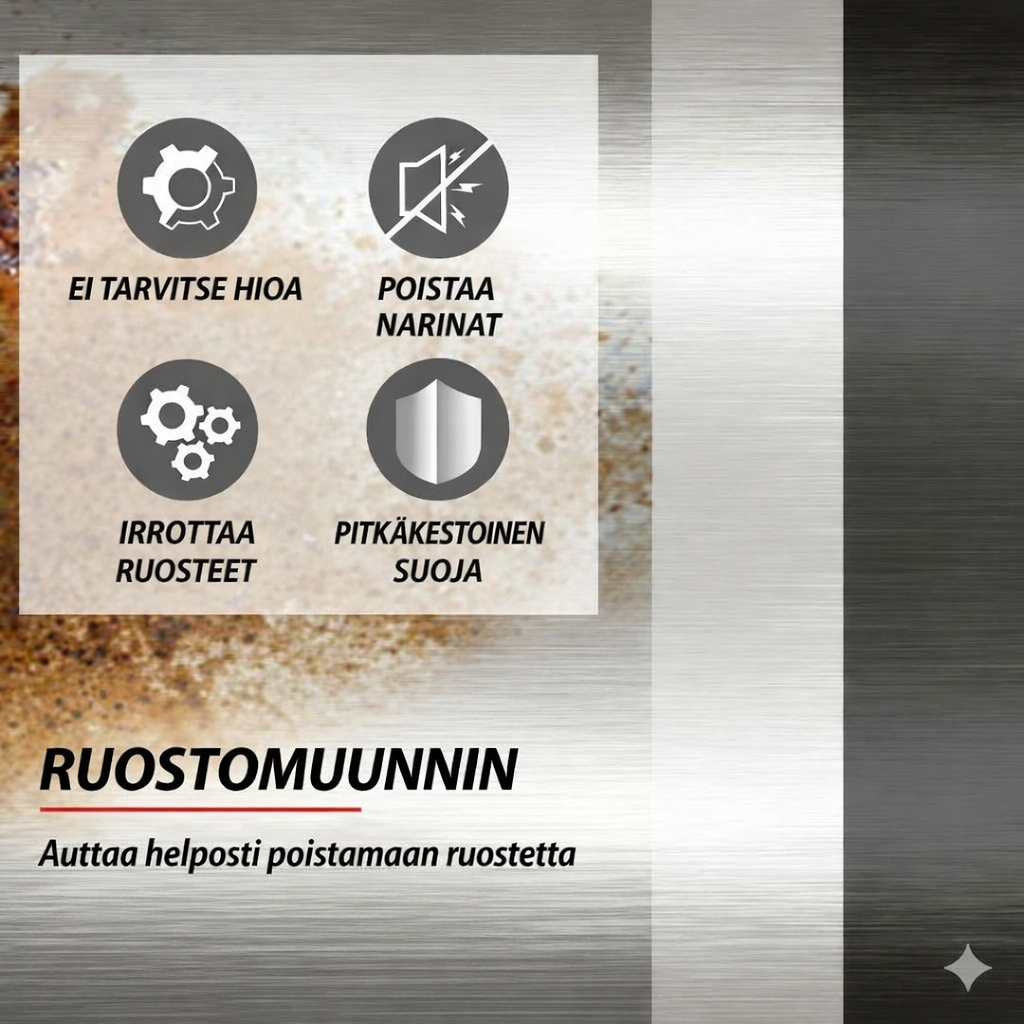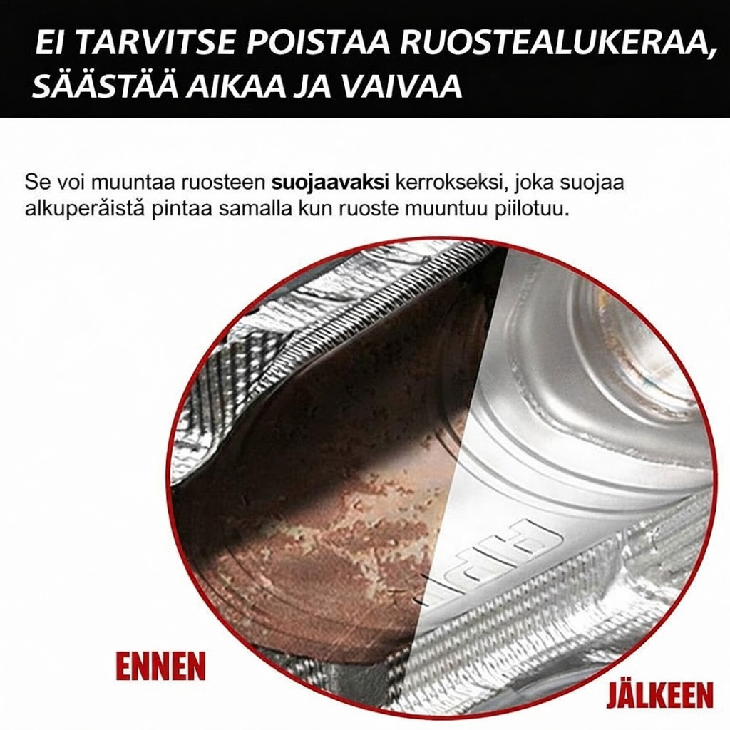 Tuote ei pelkästään puhdista – se luo vettä, kosteutta ja naarmuja kestävän suojan, joka ehkäisee uuden ruosteen muodostumisen. Näin pidentyy metallipintojen käyttöikä ja voit olla varma, että ajoneuvosi tai työkalusi säilyttävät kuntonsa säässä kuin säässä.